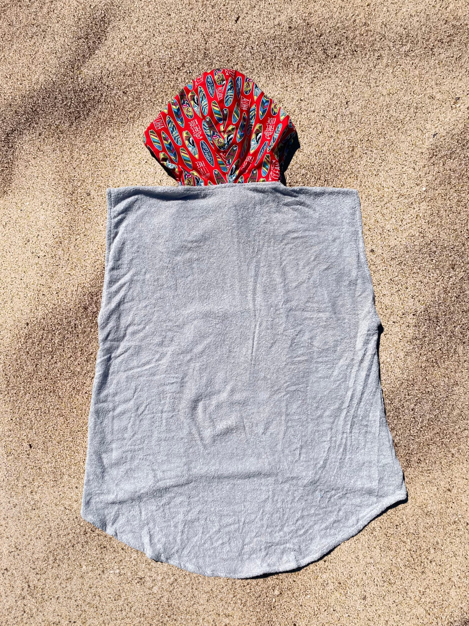 For the modern beach enthusiast, the Urban Tide surf poncho combines urban sophistication with seaside practicality. The sleek gray design with a standout red pocket offers a contemporary look that’s both stylish and functional.
